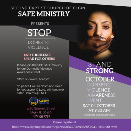 Join Second Baptist Church of Elgin’s SAFE Ministry as we come together to raise awareness, support survivors, and stand against domestic violence. Together, we can break the silence and bring hope. Saturday, October 4th at 9:30 AM — breakfast will be provided.