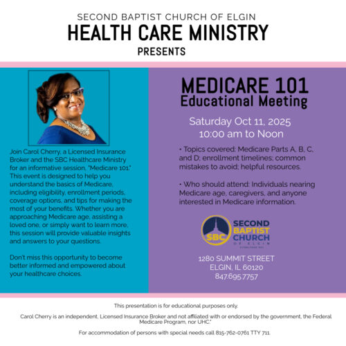 Learn the basics of Medicare and get answers to your questions at this informative session hosted by Second Baptist Church of Elgin’s Health Care Ministry. Join Carol Cherry, Licensed Insurance Broker, on Saturday, October 11, 2025, from 10:00 AM to Noon, for insights on eligibility, enrollment, coverage options, and resources. A valuable event for those nearing Medicare age, caregivers, and anyone seeking clarity on healthcare choices.