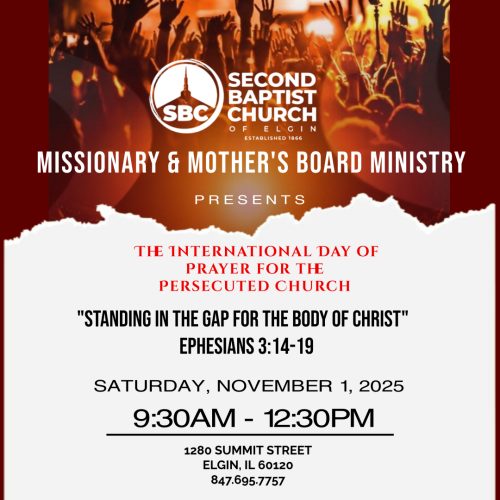 Join the Missionary & Mother’s Board Ministry of Second Baptist Church of Elgin as we come together in unity and prayer for believers around the world.
